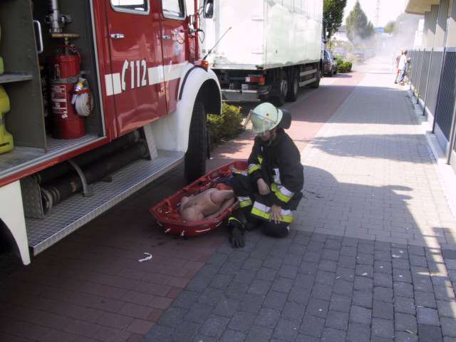 Insgesamt vier Atemschutztrupps der Groß- und Klein-Zimmerner Einsatzabteilungen durchsuchten das durch eine Nebelmaschine stark verqualmte Gebäude nach Verletzten. Zusätzlich wurde an der Hinterseite des Komplexes ein Sprungretter in Stellung gebracht, über den eine weitere Person (Übungspuppe) gerettet werden konnte. Die Klein-Zimmerner Kameraden retteten eine auf einem LKW liegende Person, welche aus einem Fenster gesprungen war.