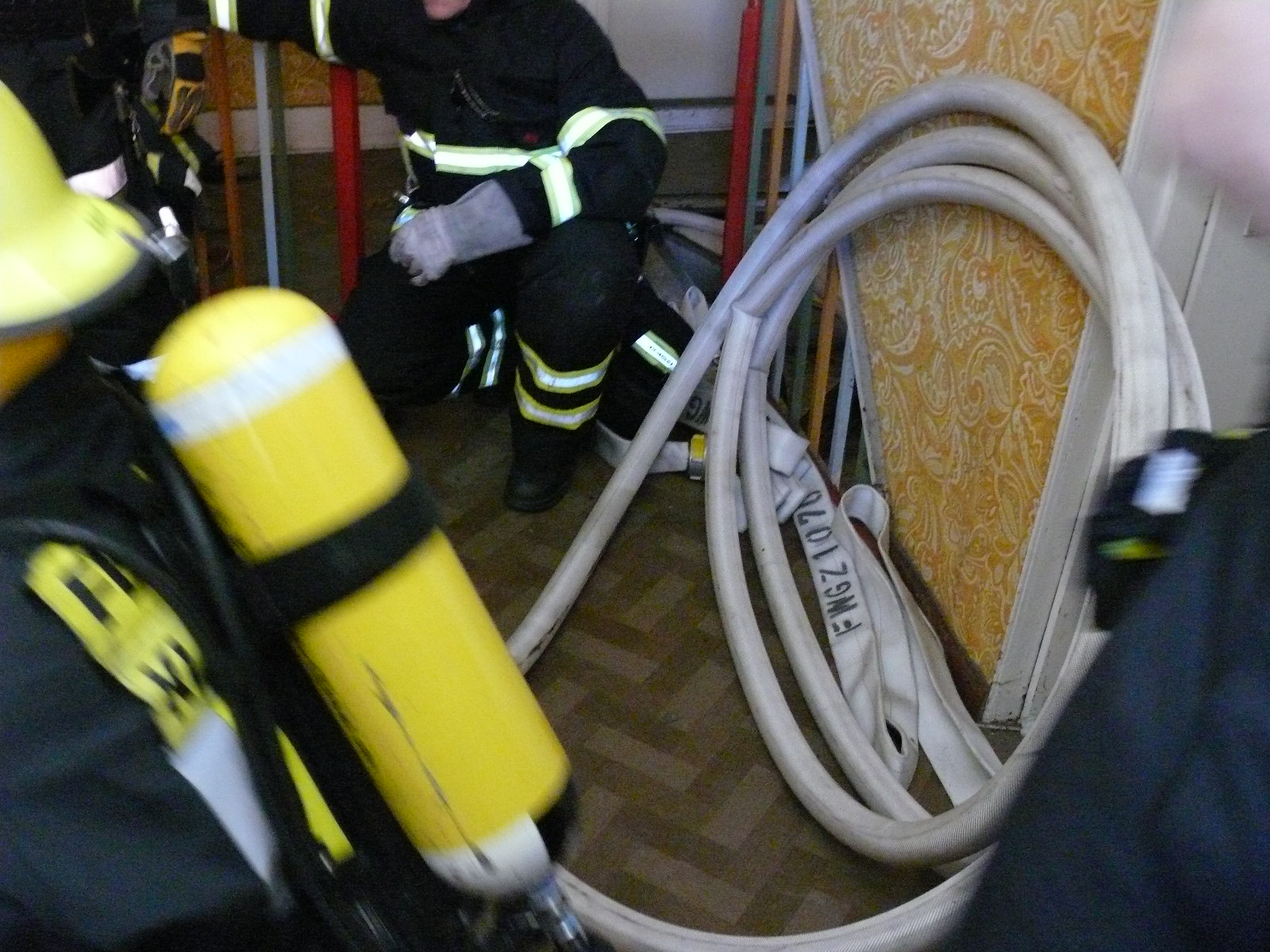 Der eigentliche Innenangriff wurde in der dritten Gruppe geübt. Hierzu trainierten die Einsatzkräfte unter möglichst realistischen Bedingungen im leerstehenden Hirschkopfhaus die Handhabung von neuen Einsatzmitteln wie dem sog. Schlauchpaket. Dieses wird im rauchfreien Bereich für den Angriffstrupp bereit gelegt und kann dann sehr einfach, auch unter Druck, für den Brandeinsatz verwendet werden.