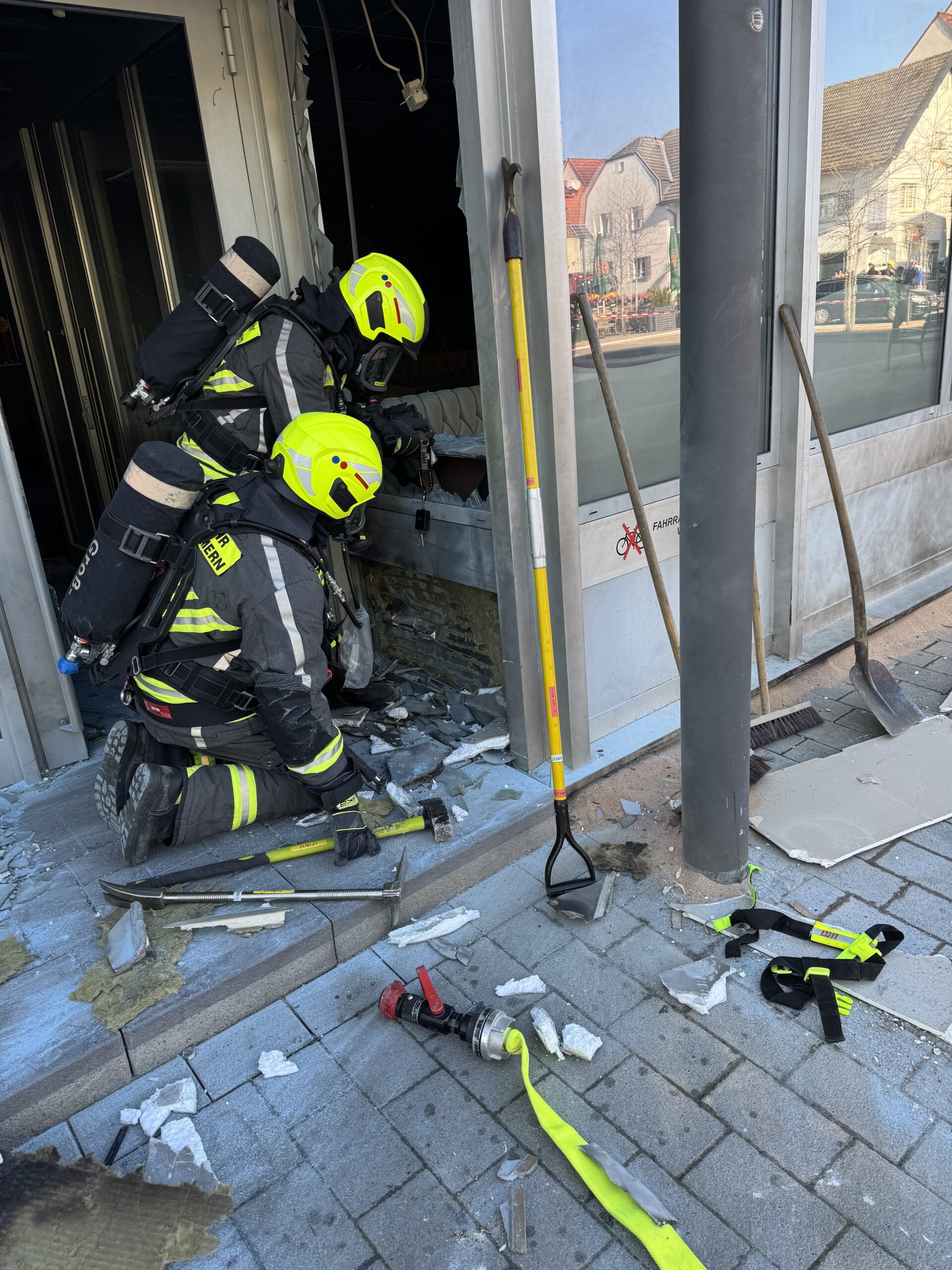 Bei Eintreffen der ersten Kräfte war das Feuer, welches sich vor Allem an der Fassade des Gebäudes befunden hatte, durch Passaten mit einem Feuerlöscher weitgehend gelöscht worden. Die Feuerwehr räumte den Gebäudekomplex, welcher mehrere Arztpraxen sowie eine Bar beherbergt, auch wegen der starken Rauchentwicklung. Im Anschluss wurden alle Geschäftsräume mittels Wärmebildkamera auf mögliche Brandbeeinflussungen hin kontrolliert und das Gebäude belüftet.
