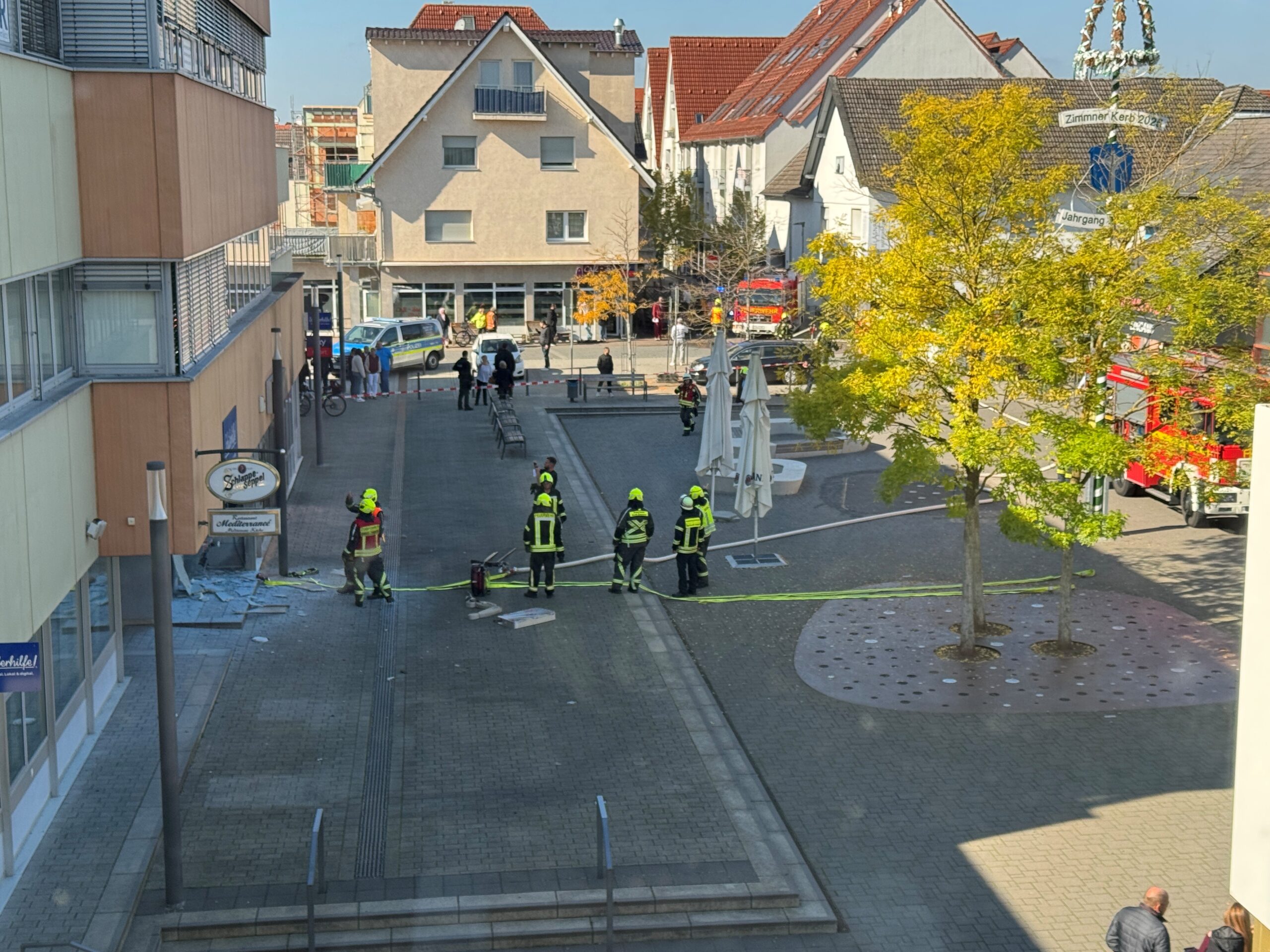 Zu einem Brandeinsatz mit Menschenleben in Gefahr wurden die Feuerwehren Groß- und Klein-Zimmern sowie Dieburg am Donnerstagmittag auf den Rathausplatz gerufen. Gemeldet war ein Brand an einem Gewerbegebäude in Folge einer Explosion. Weiterhin rückten Polizei und Rettungsdienst in die Ortsmitte an.