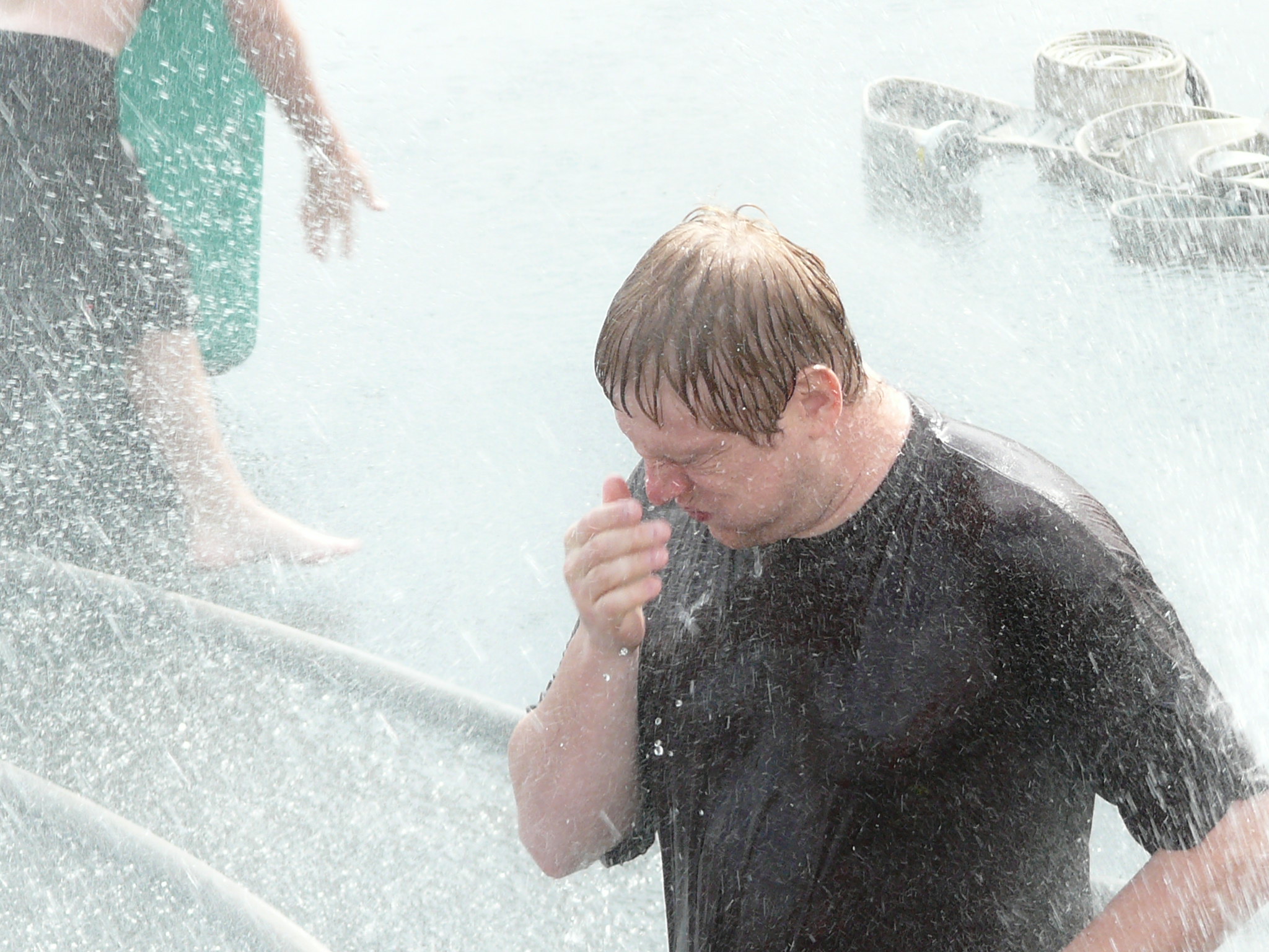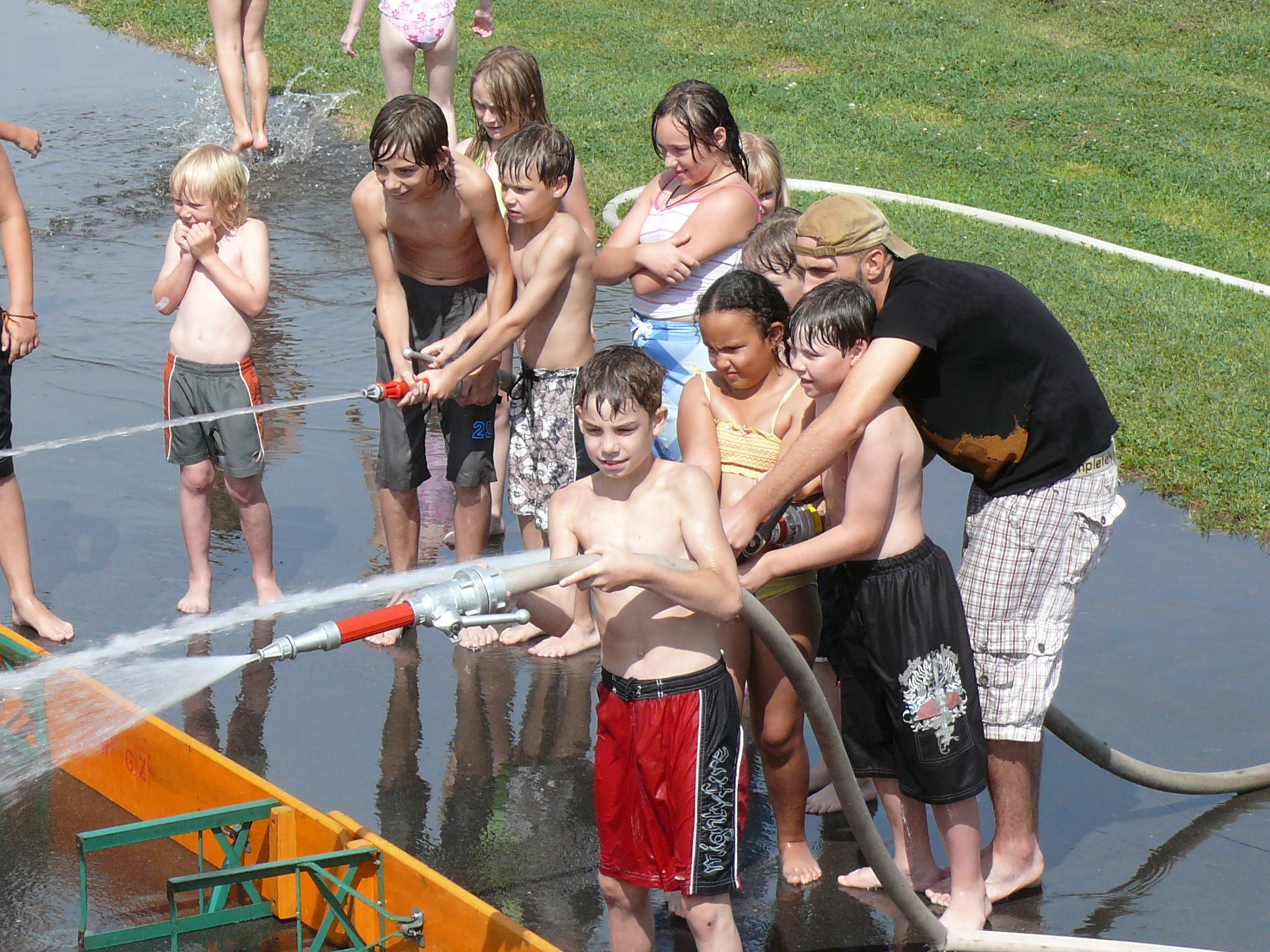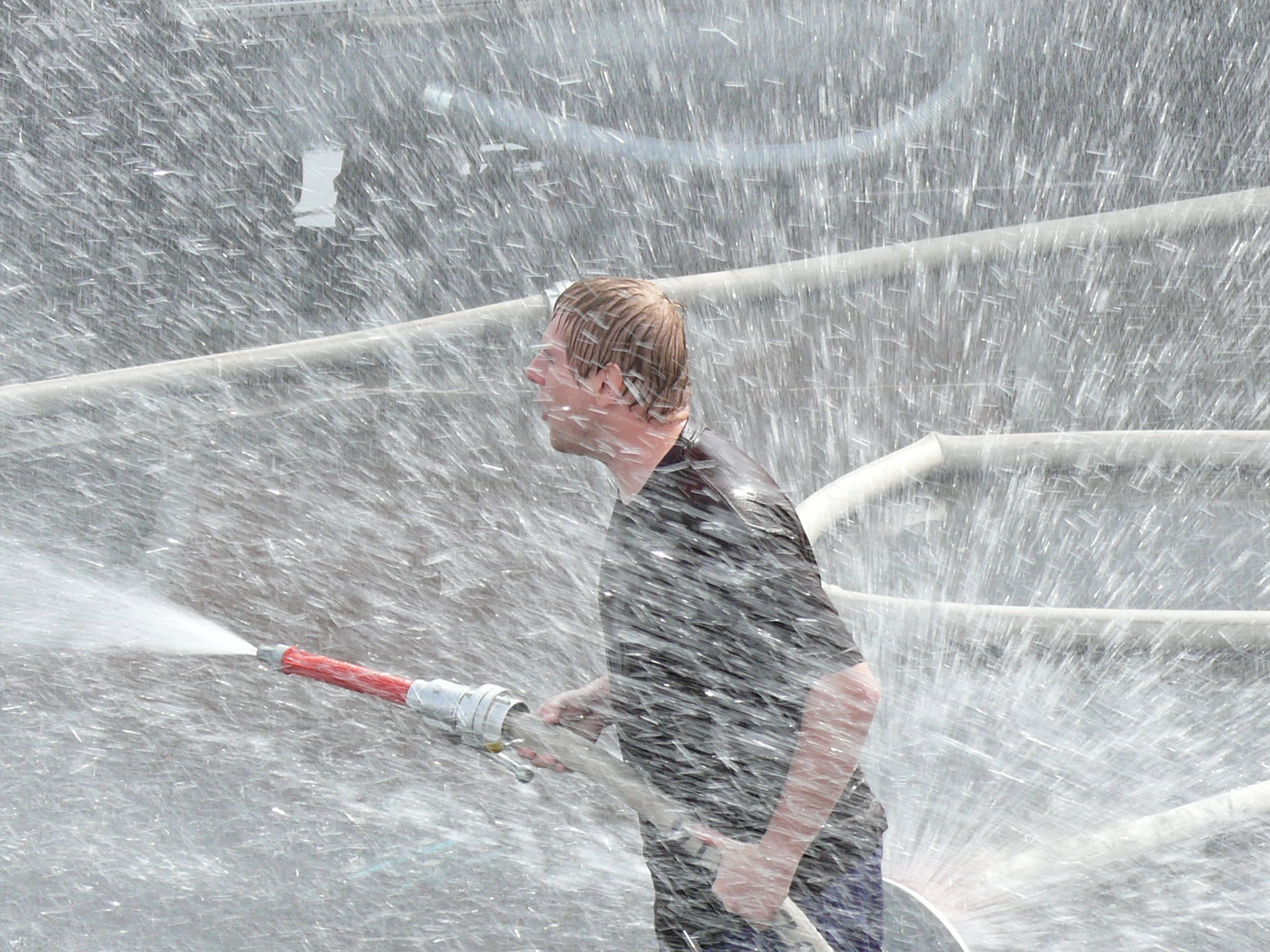 Aber der Höhepunkt sollte noch kommen. In Windeseile bauten Betreuer und Feuerwehrleute das zuvor genutzte Spielfeld ab und rüsteten mit weiteren Rohren und Hydroschilden zum großen Finale – der aufgeregt erwarteten Wasserschlacht. Durch Wasserwände und die Sprühstrahlen der Rohre wurde nun auch der letzte noch trockengebliebene nass und wurde vom Spaßvirus infiziert.