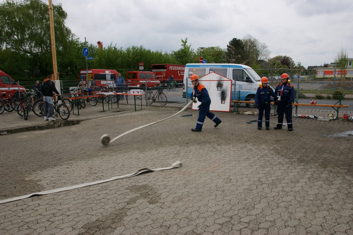Am 30. April fanden viele zumeist junge Leute den Weg ins Feuerwehhaus. Die aufwändig eingerichtete Hütchenbar war brechend voll und die freiwlligen Helfer hinter der Theke hatten alle Hände voll zu tun. Auch im Indoor-Biergarten ließen es ich sich zahlreichen Besucher bei heißen Würstchen und Steaks vom Holzkohlegrill und kalten Gertränken gut gehen. Das Traditionelle Fest am 1. Mai war trotz mäßigen Wetters gut besucht. Bei kühlen Temperaturen fanden viele Menschen den Weg ins Feuerwehrhaus, wo Sie in der geschützten Fahrzeughalle aber auch auf dem hergerichteten Hof feierten. Besonderes Highlight waren auch in diesem Jahr wieder die Aktivitäten der Jugendfeuerwehr. Mit viel Hingabe und Begeisterung sorgten die 10-17jährigen Nachwuchsfeuerwehrleute für abwechlungsreiche Beschäftigung bei den jungen Festbesuchern. Krönung war die Schauübung der Jugendfeuerwehr – hier galt es ein fiktives Feuer in einer Garage zu löschen.