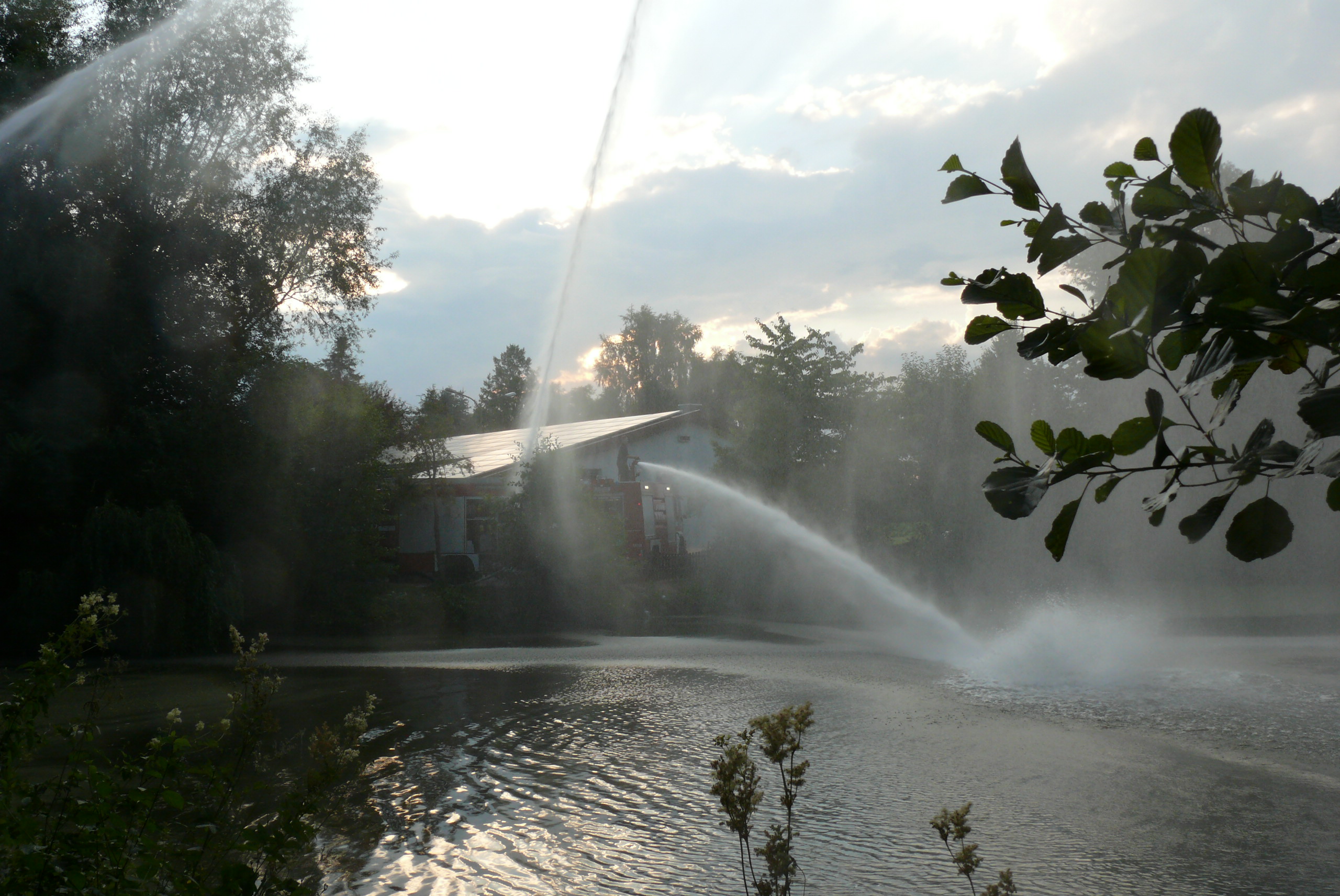 Die Mitglieder der Einsatzabteilung nutzten ihr donnerstagliches Zusammenkommen um die Angler zu unterstützten. "Gleichzeitg machen wir eine Maschinistenausbildung" freute sich Wehrführer Christoph Pullmann. Mit der Tragkraftspritze, einer tragbaren Pumpe, wurde Wasser aus der Gersprenz in den kleinen Anglerteich gepumpt. "Fast 1000 Liter pro Minute schafft die Pumpe", erklärt der stellvertretende Wehrführer Marcel Goeden. Die beiden großen Löschfahrzeuge sorgten für eine Belüftung des großen Teiches, indem sie Wasser aus dem Teich pumpten und über verschiedene Wege wieder hinein schossen. Beide Fahrzeuge haben eine Pumpenleistung von über 3500 Litern pro Minuten. Deutlich war zu erkennen, dass diese Maßnahme den mit Algen bedeckten Seen gut taten. Möglicherweise muss die Feuerwehr in den nächsten Tagen wieder zum Einsatz kommen, wenn sich die Hitzeperiode wiederholt.