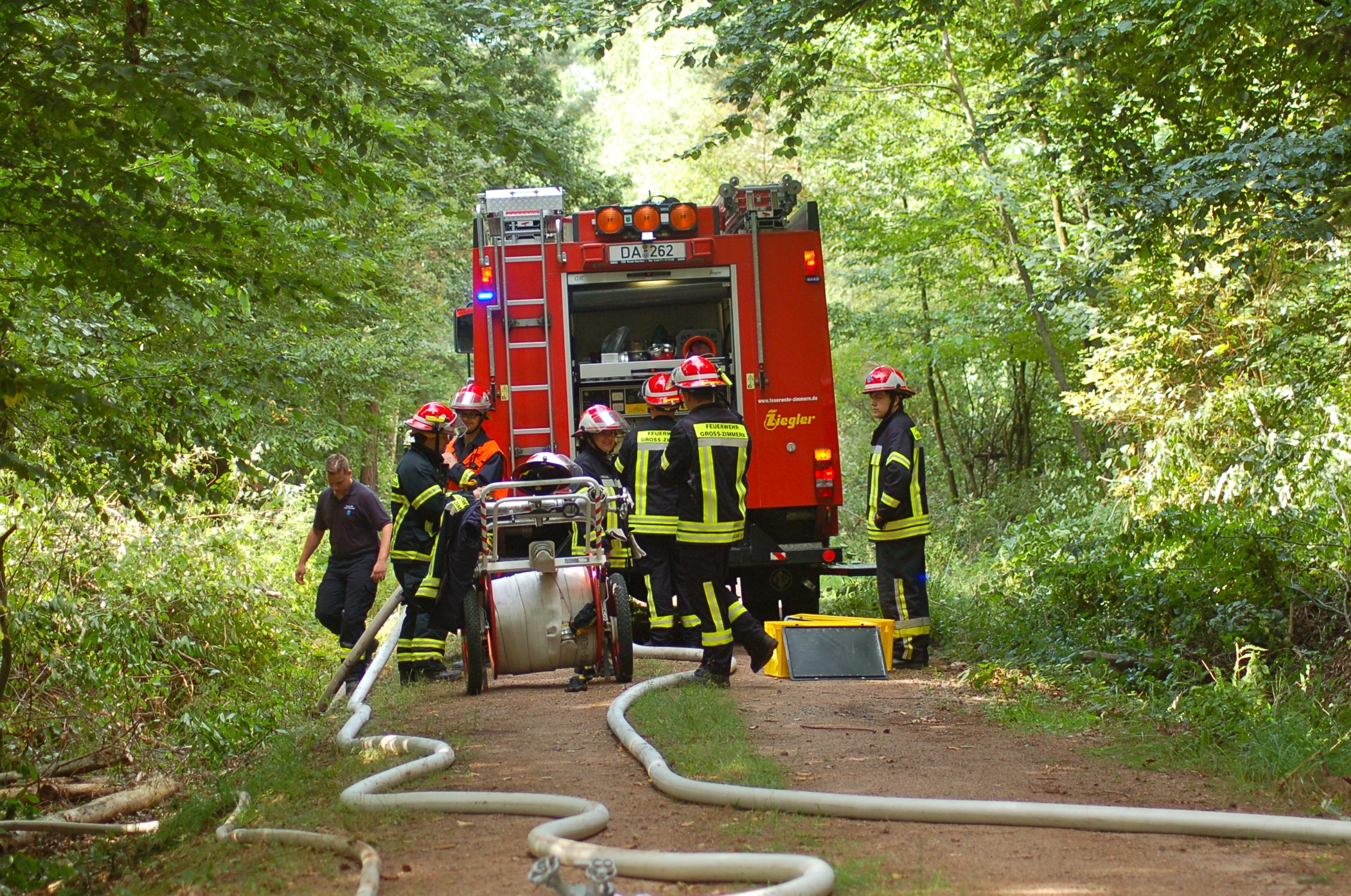 Unter der Einsatzleitung der Feuerwehr Dieburg wurde zusammen mit den Kräften aus Münster, Messel, Babenhausen und Groß-Umstadt der Ernstfall geprobt. Schwerpunkt war das Üben der aufwendigen Logistik, um ausreichend Löschwasser zum Brandort zu bekommen. Hierzu fuhren mehrere Tanklöschfahrzeuge im sog. Pendelverkehr von einer Wasserentnahmestelle zu zwei jeweils 5000 und 3000 Liter fassenden Wasserbecken, welche provisorisch im Wald errichtet wurde. Eines der Becken stammte aus der Waldbrandausrüstung der Feuerwehr Klein-Zimmern. Von den Becken wurde das Wasser von der Feuerwehr Münster zum Löschfahrzeug der Feuerwehr Groß-Zimmern gepumpt, welches wiederum die Angriffsrohre mit Wasser speiste. Die Feuerwehr Groß-Zimmern übernahm während der Übung zwei Abschnittsleitungen. "Die durch den Landkreis Darmstadt-Dieburg organisierte Übung sollte unter realistischen Bedingungen ablaufen" erklärt der Groß-Zimmerner Gemeindebrandinspektor James Bennett. Daher wurden die Kräfte aus Groß- und Klein-Zimmern wie bei einem echten Einsatz alarmiert. Das Anrücken zur Einsatzstelle im Dieburger Wald erfolgte mit Sondersignal. "Einerseits muss auch das geübt werden, andererseits kann nur so realistische die Zeit bis zum Eintreffen aller Kräfte am Brandort ermittelt werden" beschreibt Bennett weiter. Fotos: Feuerwehr Dieburg / Feuerwehr Klein-Zimmern